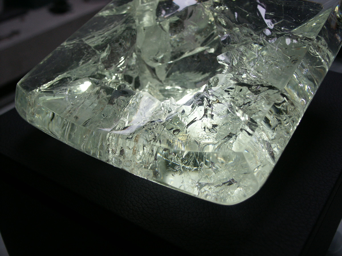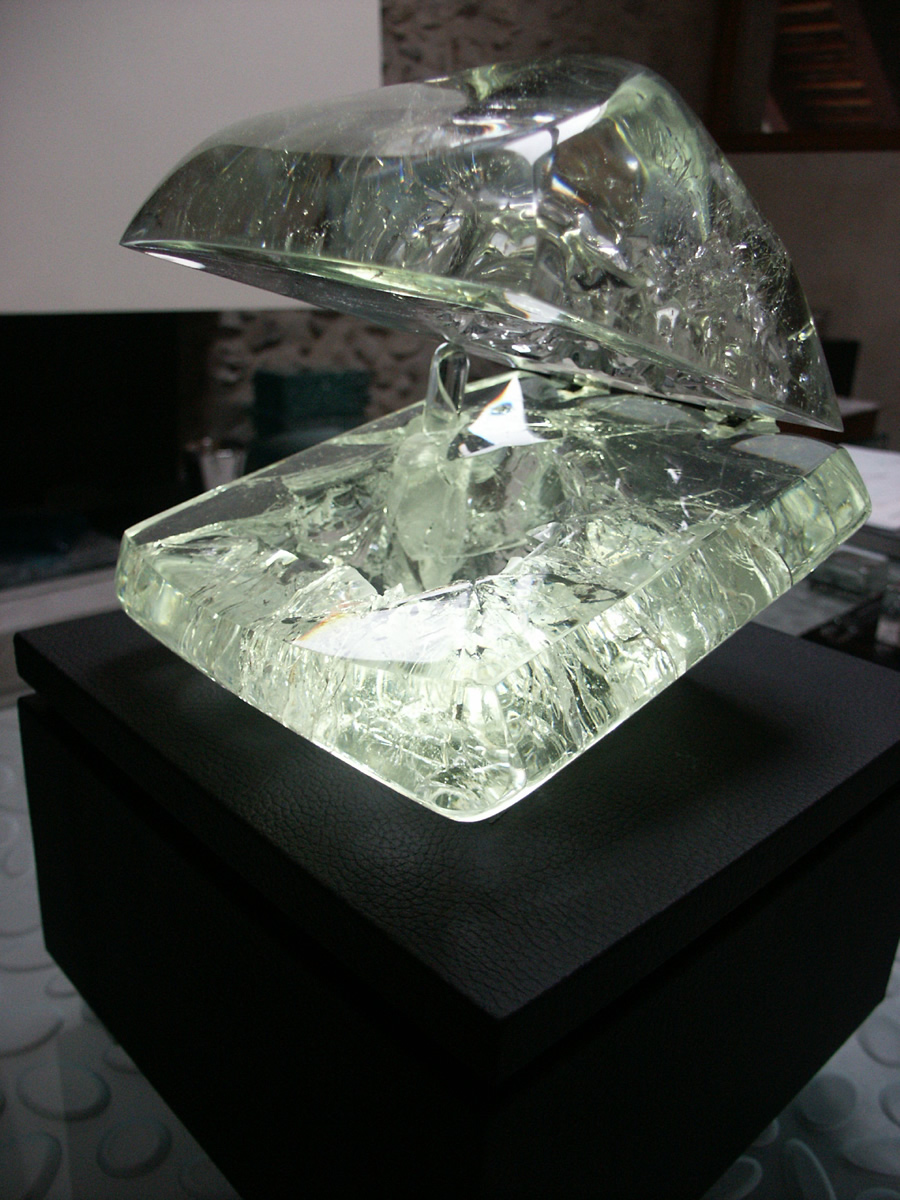 Watch presentation case on mini silent piston, transparent crystal, molded, bubbled, polished, black leather matt pedestal, RGB LED lighting, watchmaker, Geneva, Switzerland.