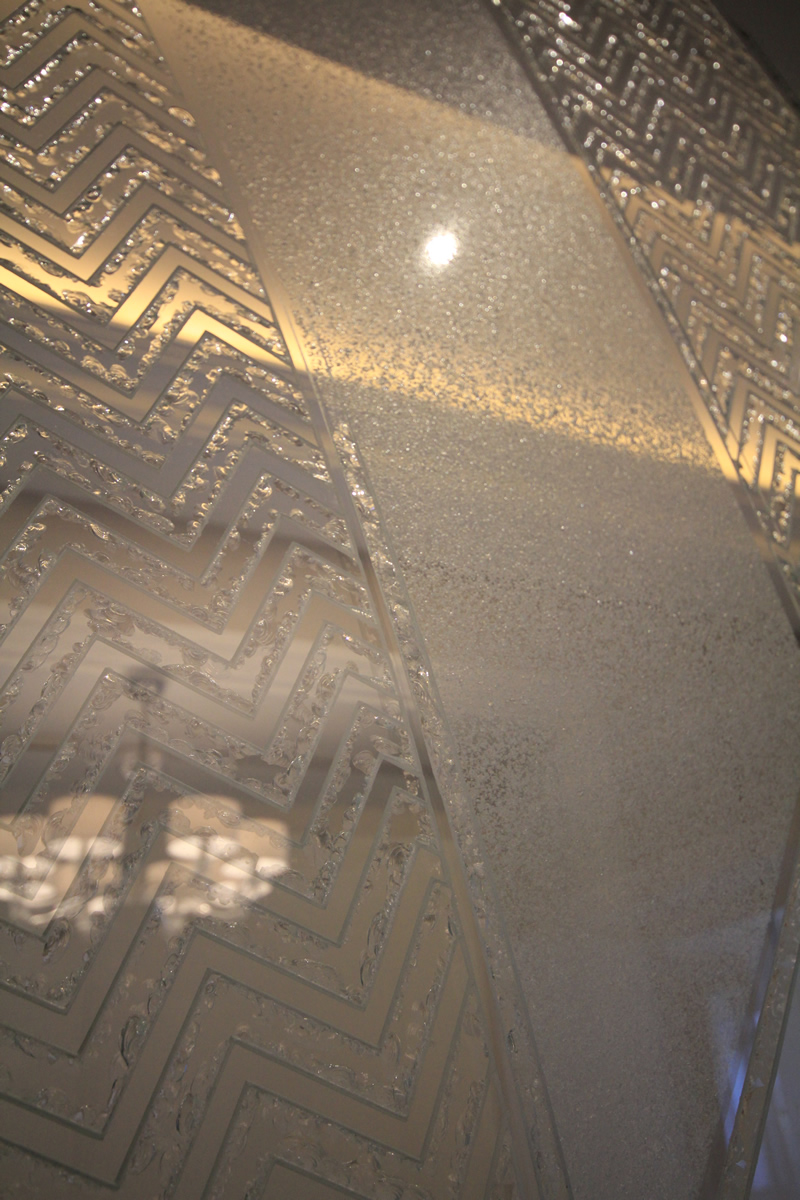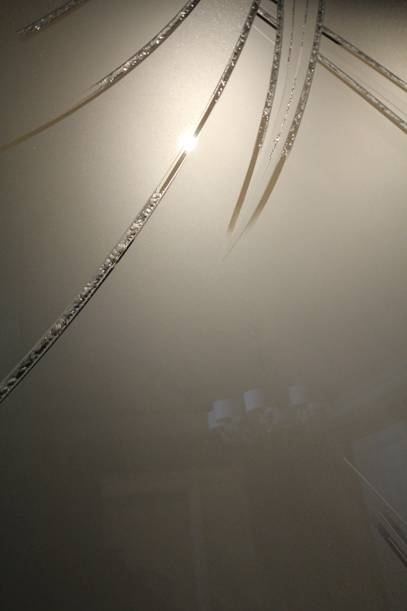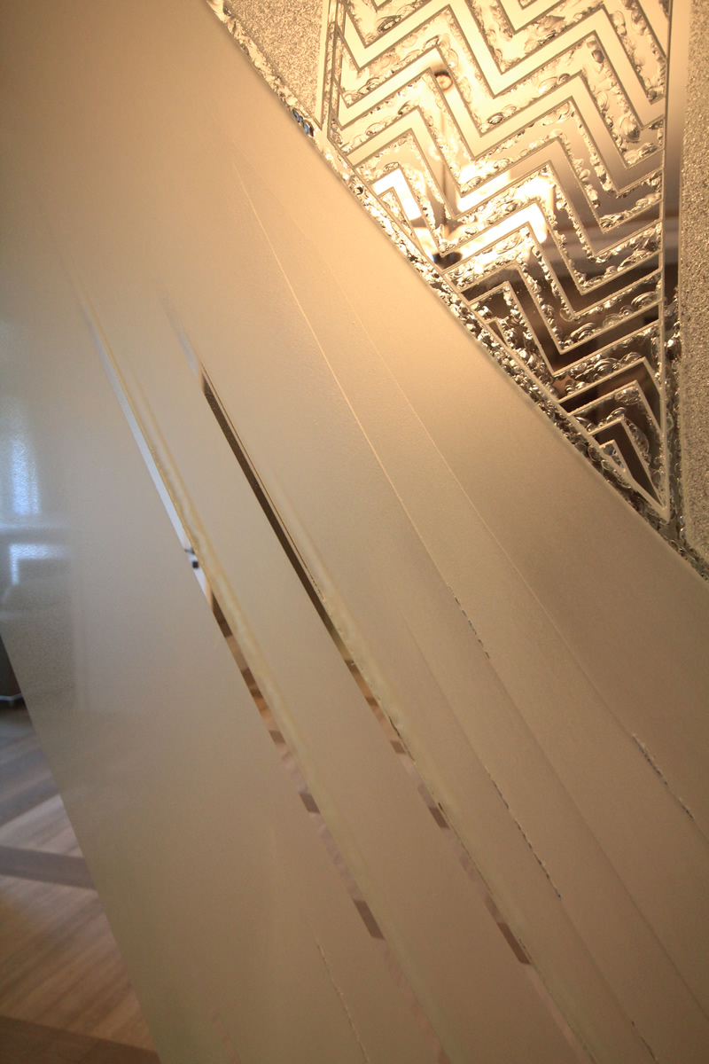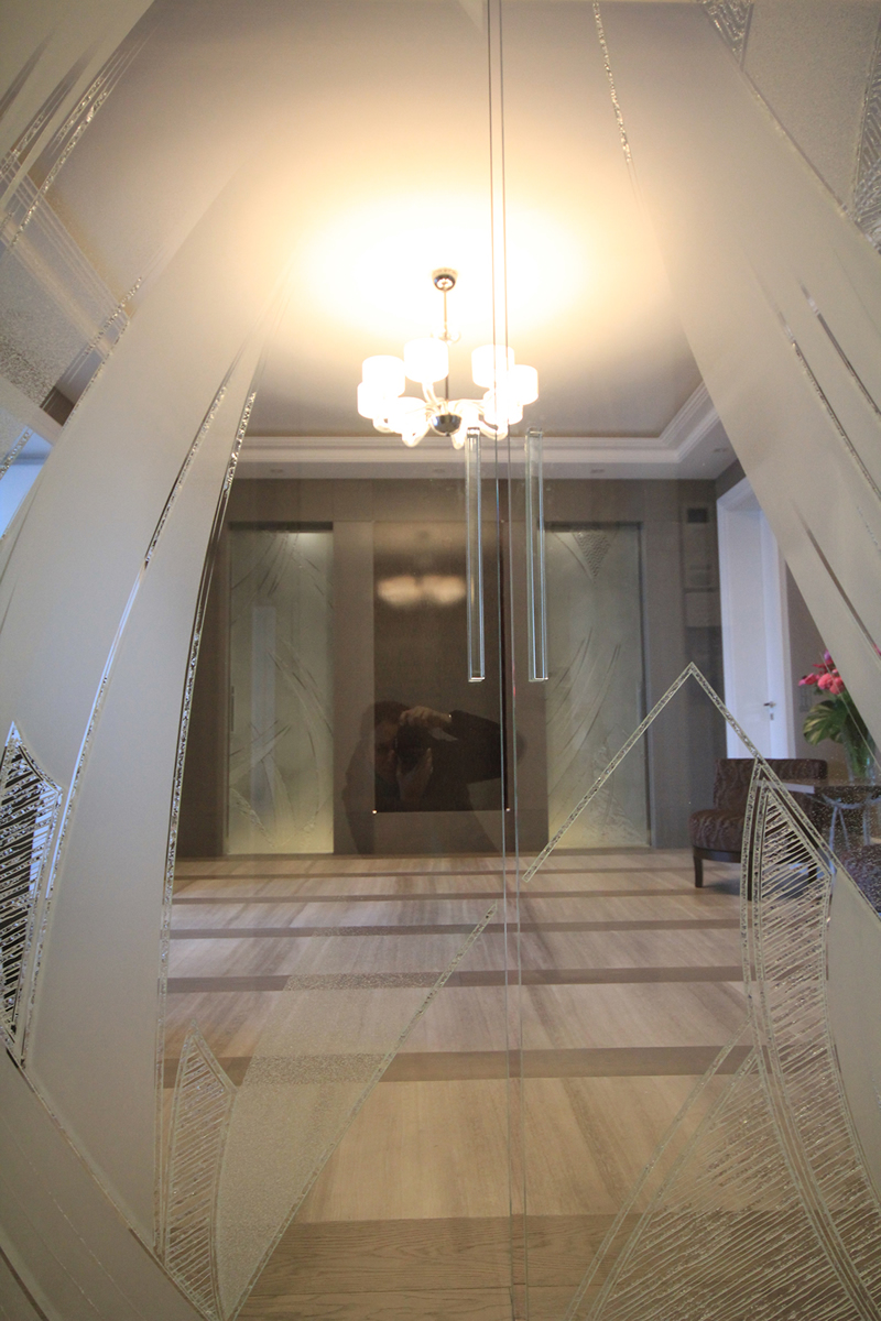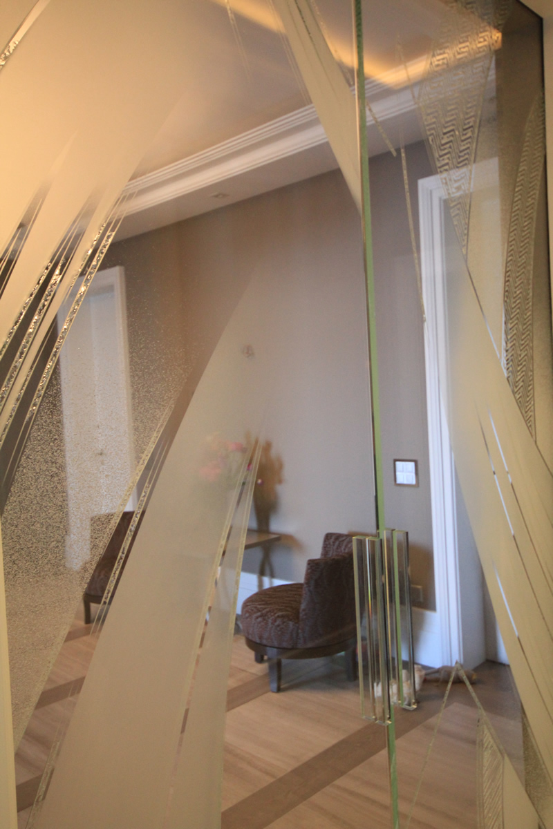 Portes coulissantes manuelles, verre float extra-blanc sablé grain fin ,gros grain, gravé et bouchardé à la main, appartement privé, Genève, Suisse.1337