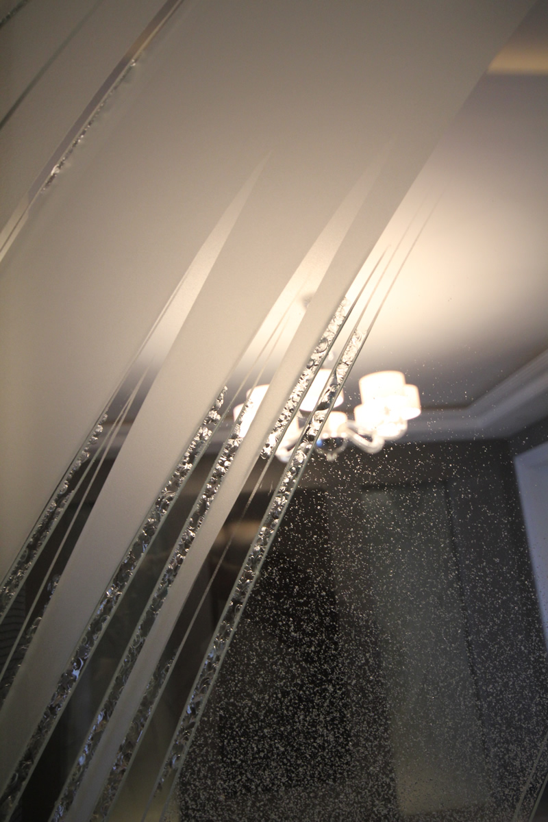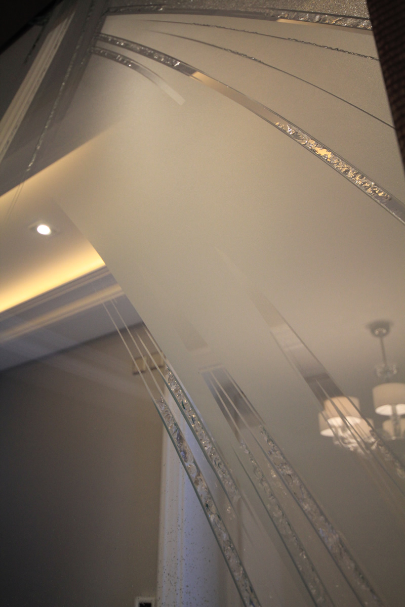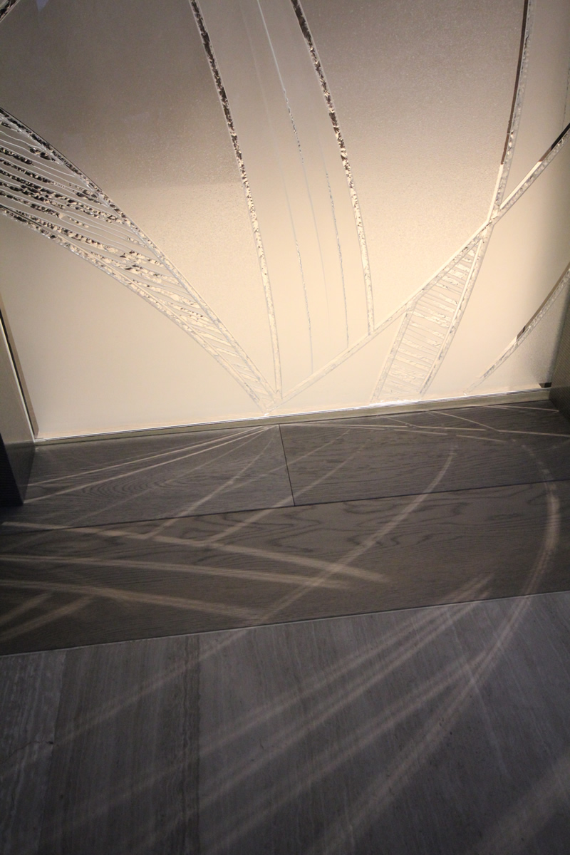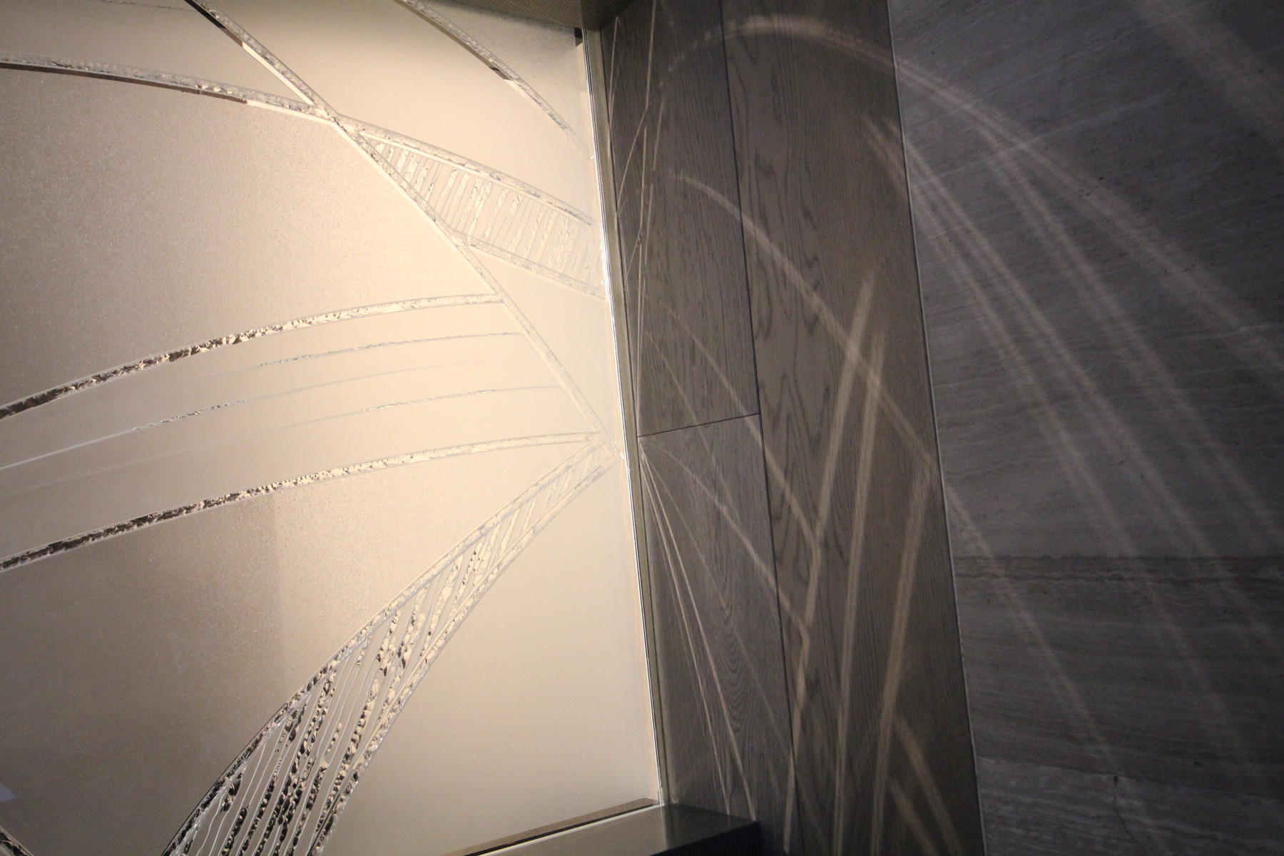 Portes coulissantes manuelles, verre float extra-blanc sablé grain fin ,gros grain, gravé et bouchardé à la main, appartement privé, Genève, Suisse.1337
