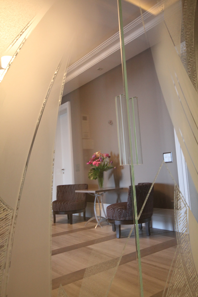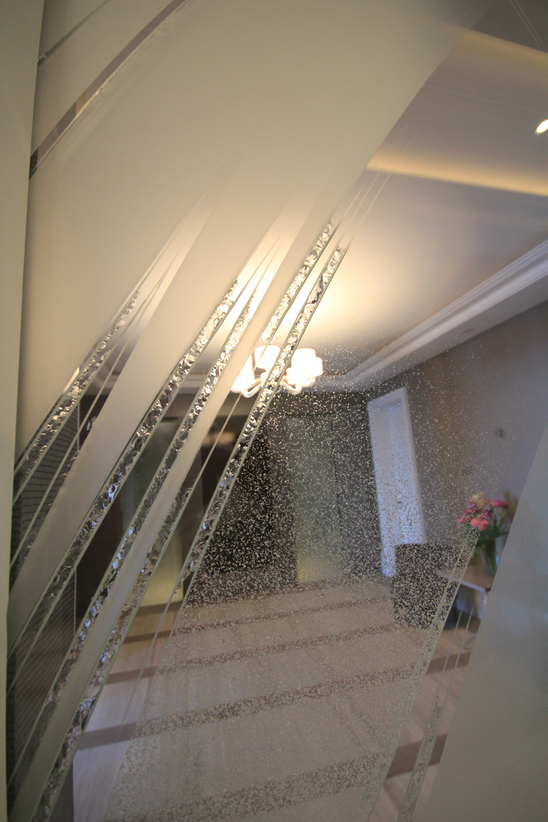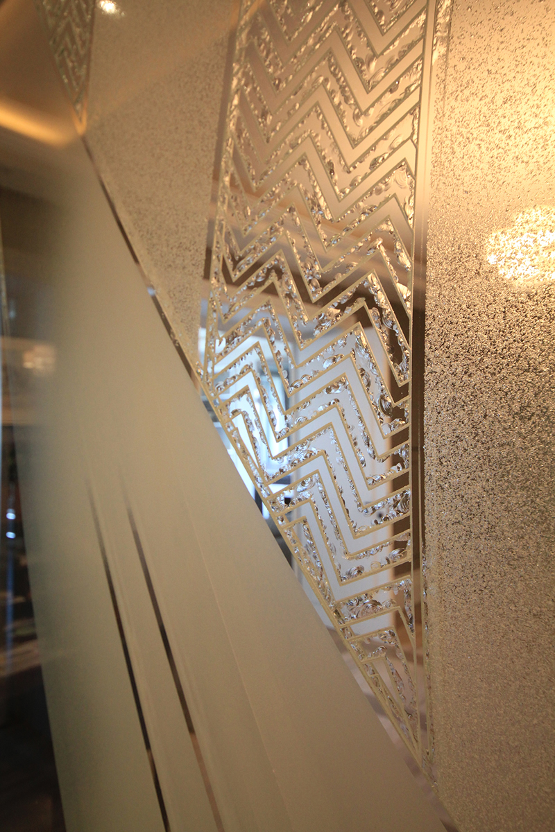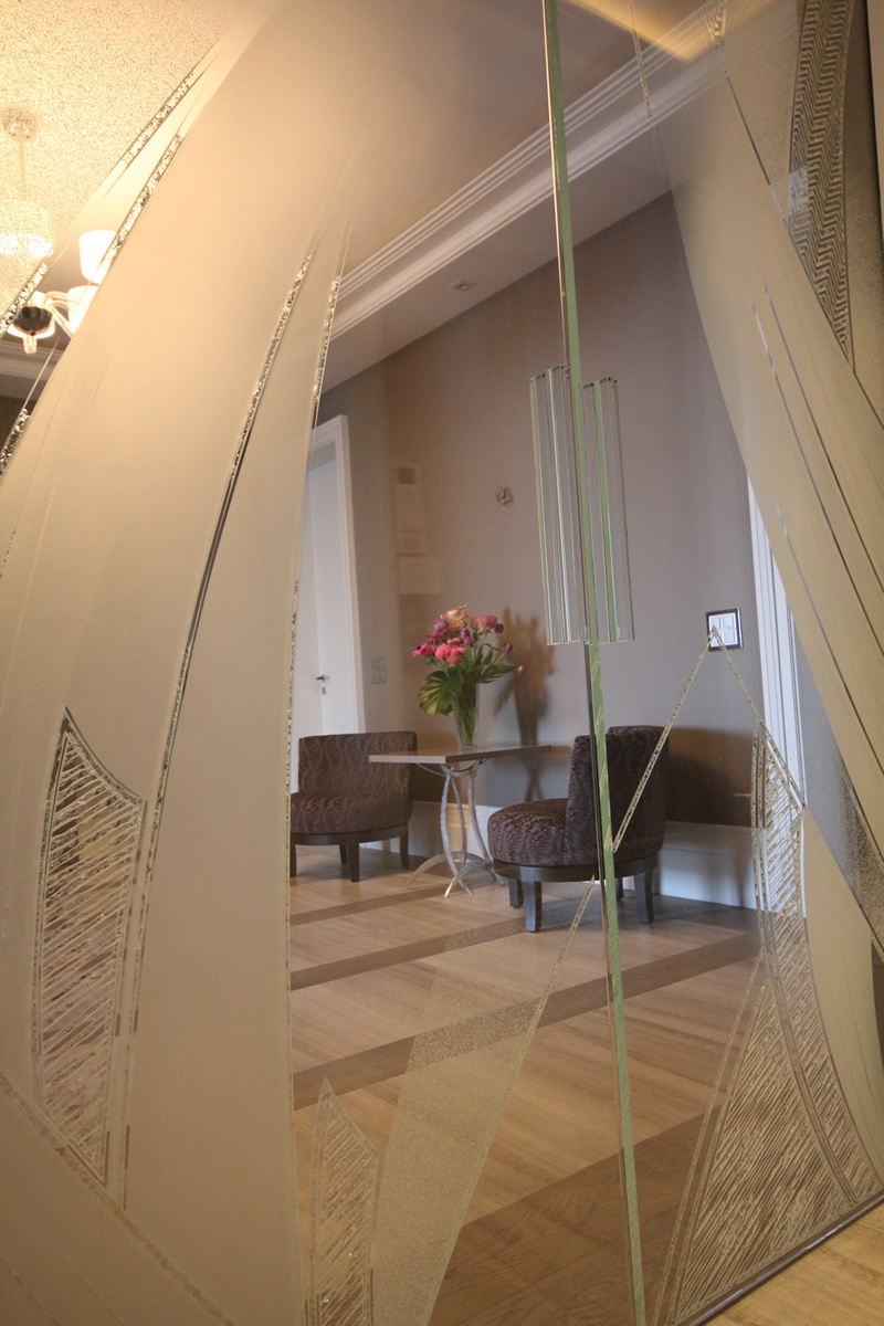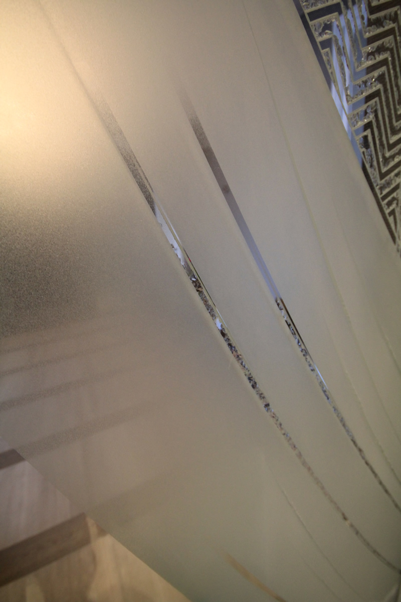 Portes coulissantes manuelles, verre float extra-blanc sablé grain fin ,gros grain, gravé et bouchardé à la main, appartement privé, Genève, Suisse.1337
