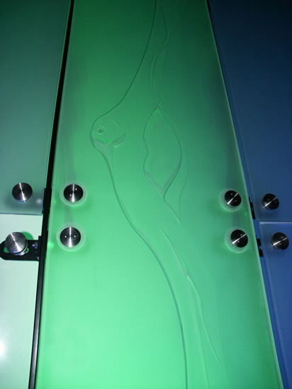 Habillage, verre float extra-blanc feuilleté, sablé et gravé, superposition de verre float, bords rodés, structures en acier thermolaqué , pièces de fixation en serrurerie fine inox brossé, éclairage, domaine viticole, Peissy, Genève, Suisse.