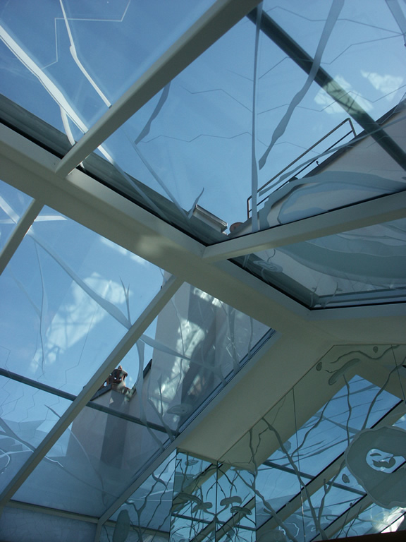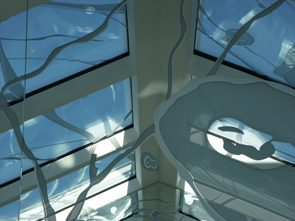 Verrière attique, verre float extra-blanc et miroirs sablés, gravés à la main, structures acier thermolaqué blanc mat, hôtel particulier, Genève, Suisse.