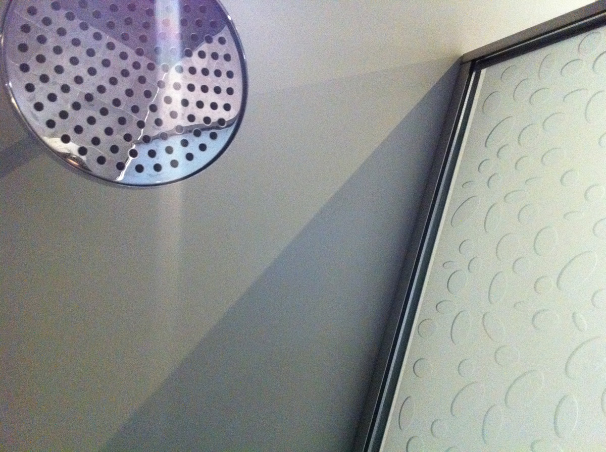 Paroi de douche , verre float extra-blanc de sécurité, sablé et gravé à la main, cadre en serrurerie fine inox poli brillant, appartement privé, Nyon, Vaud, Suisse.